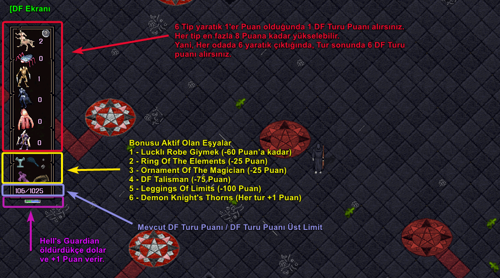 DF Turu : Toplam atılan tur sayısı bonus verir. DF Puanı ile karıştırılmaması gerekir. 5 oda + 1 bos = 1 Tur demektir. Bu bonus hiç bir zaman sıfırlanmaz.