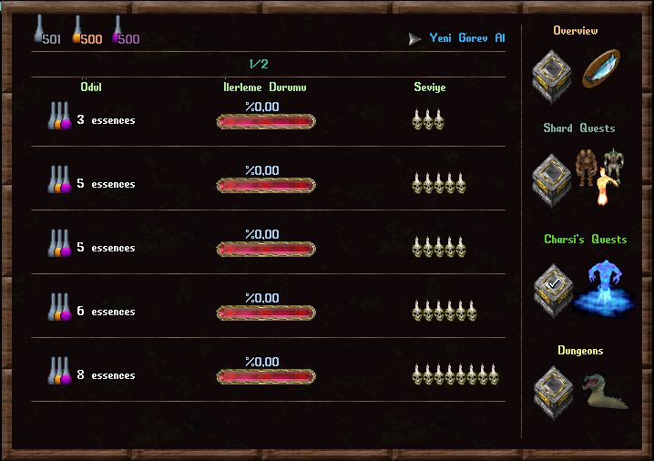 Paperdoll’dan Quest’e basıp Charsi Görevleri sekmesinden yeni görev al diyebiliriz.