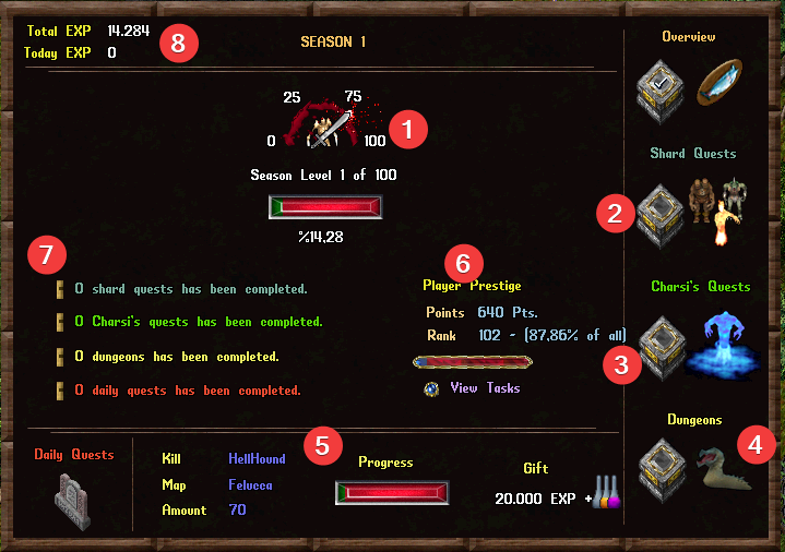 Her sezon seviyesi 1 puan ve her zindan tamamlanması 1 puan verir.